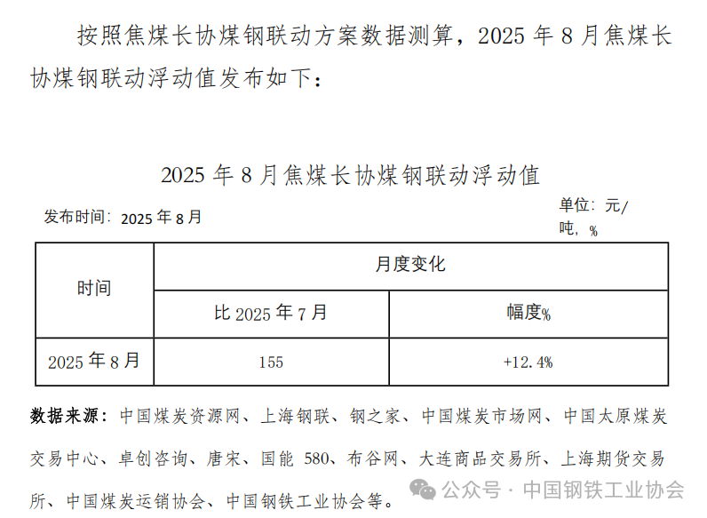 2025年8月焦煤長協(xié)煤鋼聯(lián)動浮動值