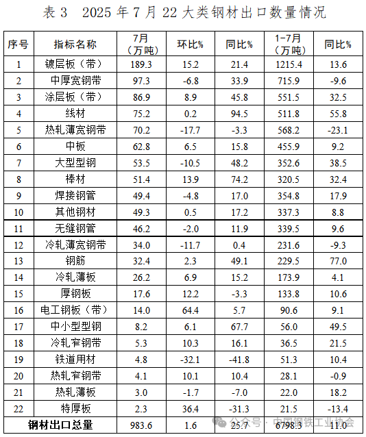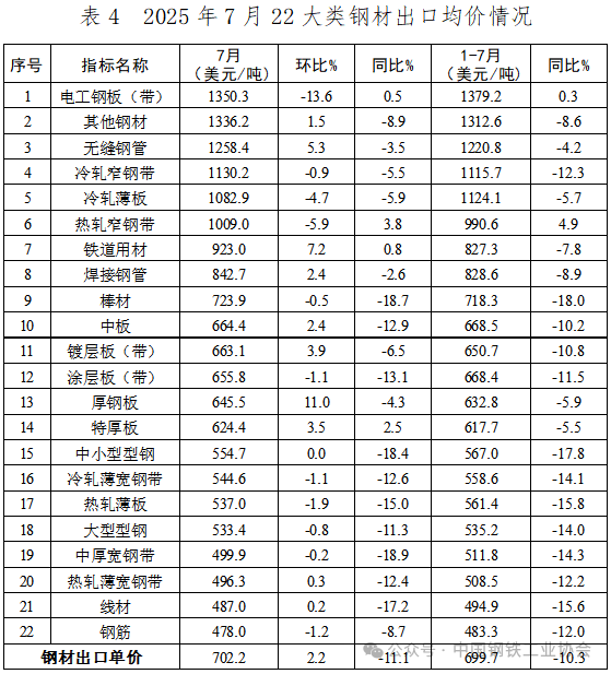 7月,22大類鋼材品種中,有8類品種出口量環(huán)比下降,減量主要來自熱軋板卷產(chǎn)品。其中,熱軋薄寬鋼帶、大型型鋼、冷軋薄寬鋼帶和鐵道用材等4個(gè)品種出口量環(huán)比降幅超過10%,中厚寬鋼帶、焊接鋼管、無縫鋼管及熱軋薄板等品種出口量環(huán)比也出現(xiàn)一定程度下降。其余14類品種出口量環(huán)比出現(xiàn)增長(zhǎng),增量主要來自鍍層板(帶)、涂層板(帶)和棒材。1-7月,鍍層板(帶)是累計(jì)出口量最大的品種,占鋼材出口總量的17.9%;熱軋板卷產(chǎn)品累計(jì)出口量同比繼續(xù)呈下降態(tài)勢(shì),但中厚寬鋼帶和熱軋薄寬鋼帶兩個(gè)主要品種累計(jì)出口量同比降幅小幅收窄;線材和棒材累計(jì)出口量同比持續(xù)擴(kuò)大。7月,多數(shù)品種出口單價(jià)保持在較穩(wěn)定區(qū)間,電工鋼板(帶)出口單價(jià)環(huán)比跌幅最為明顯,為13.6%;厚鋼板出口單價(jià)環(huán)比漲幅最大,為11.0%。1-7月,電工鋼板(帶)和熱軋窄鋼帶2個(gè)品種出口單價(jià)同比已實(shí)現(xiàn)正增長(zhǎng),另有冷軋窄鋼帶等部分品種出口單價(jià)降幅同比收窄。
