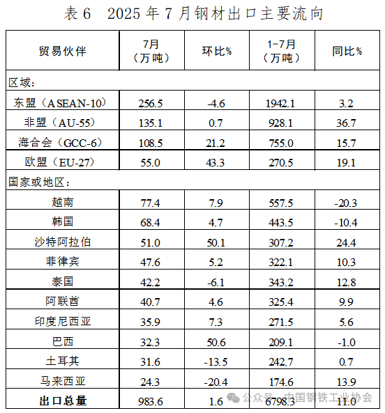 7月,我國(guó)對(duì)東盟出口鋼材規(guī)模持續(xù)下降,但降幅收窄;對(duì)海合會(huì)國(guó)家和歐盟出口規(guī)模環(huán)比明顯增長(zhǎng)。分國(guó)別來看,對(duì)越南、韓國(guó)及巴西的出口環(huán)比止跌回升,對(duì)其他拉丁美洲和東南亞主要國(guó)家的出口環(huán)比則出現(xiàn)不同程度下降。