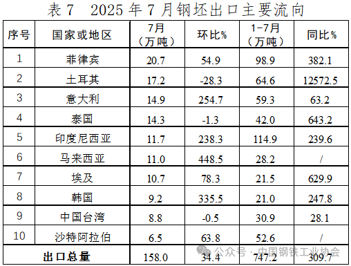 7月,我國(guó)鋼坯出口環(huán)比增長(zhǎng),向菲律賓、意大利、印度尼西亞、馬來西亞等國(guó)家出口環(huán)比持續(xù)大幅增長(zhǎng),向土耳其出口環(huán)比降幅近30%。