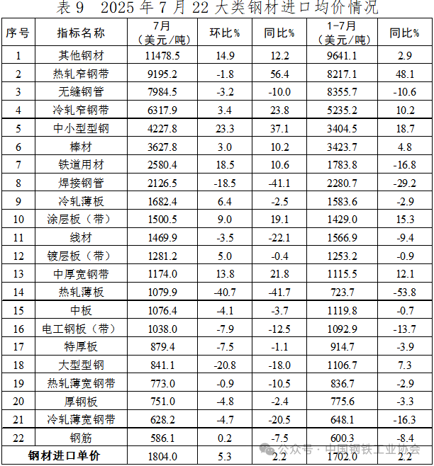 2025年7月,我國(guó)鋼材進(jìn)口規(guī)模持續(xù)萎縮,為近10年以來單月進(jìn)口量最低水平。各主要品種進(jìn)口量環(huán)比大多下降,進(jìn)口前5位的品種占當(dāng)月我國(guó)鋼材進(jìn)口總量的比重較上月有所下降。7月,我國(guó)鋼材的主要進(jìn)口來源及結(jié)構(gòu)仍保持穩(wěn)定,除自中國(guó)臺(tái)灣進(jìn)口鋼材環(huán)比回升外,自其它主要國(guó)家進(jìn)口鋼材數(shù)量環(huán)比均下降,且降幅大于總體水平。