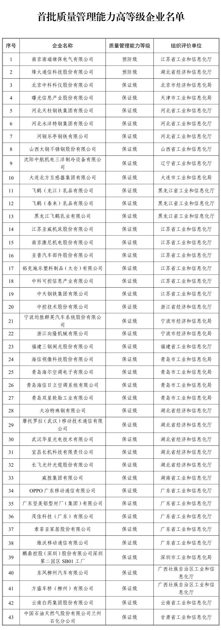 關(guān)于公布首批質(zhì)量管理能力高等級(jí)企業(yè)名單的通知