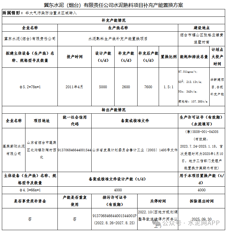 公示顯示,冀東水泥(煙臺)5000t/d熟料生產(chǎn)線補(bǔ)充產(chǎn)能2600t/d,補(bǔ)充后產(chǎn)能為7600t/d,退出產(chǎn)能來自蓬萊蔚陽水泥有限公司一條4000t/d熟料生產(chǎn)線,置換比例1.5:1。