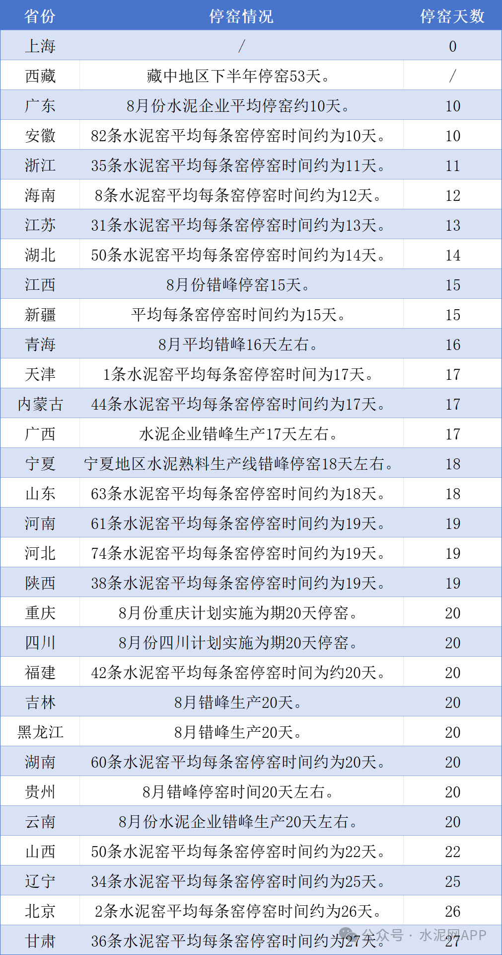 另據(jù)市場反饋,福建地區(qū)水泥企業(yè)計(jì)劃9月錯峰停窯18天;河南省水泥企業(yè)8月15號起停窯20天;湖南9月1日-12月31日錯峰生產(chǎn)天數(shù)基數(shù)不少于70天;云南計(jì)劃三季度累計(jì)停窯50天;東北地區(qū)9月繼續(xù)執(zhí)行錯峰計(jì)劃,停窯天數(shù)在15天左右...