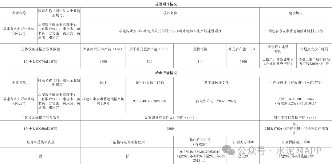 置換方案顯示,福建省永安萬年水泥一條4500t/d熟料線補充產(chǎn)能800t/d,補充后產(chǎn)能為5300t/d,退出產(chǎn)能來自同企業(yè)一條2500t/d熟料線(800t/d用于該項目,剩余1700t/d用于其他項目)。