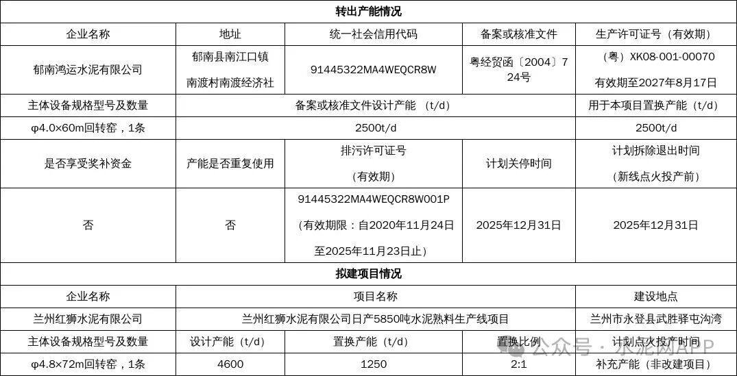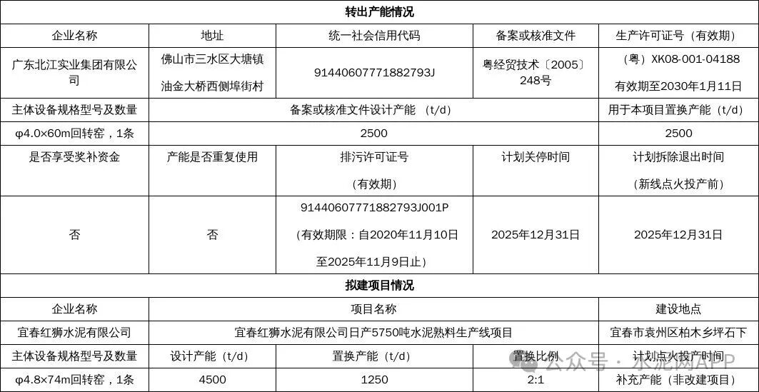 置換方案顯示,廣東北江實(shí)業(yè)集團(tuán)轉(zhuǎn)出一條2500t/d熟料生產(chǎn)線,用于補(bǔ)充宜春紅獅水泥一條4500t/d熟料線,補(bǔ)充后產(chǎn)能為5750t/d。郁南鴻運(yùn)水泥轉(zhuǎn)出一條2500t/d熟料生產(chǎn)線,用于補(bǔ)充蘭州紅獅水泥一條4600t/d熟料線,補(bǔ)充后產(chǎn)能為5850t/d。
