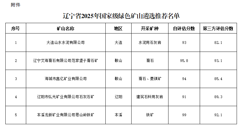 附件:遼寧省2025年國家級綠色礦山遴選推薦名單