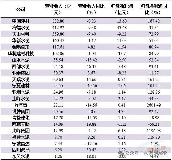 表1:2025年上半年水泥上市公司營(yíng)收、利潤(rùn)情況
