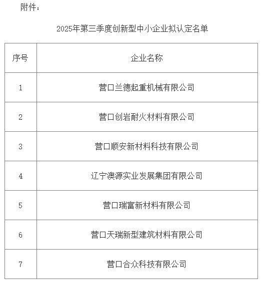 按省工信廳《關(guān)于做好2025年度創(chuàng)新型中小企業(yè)申報(bào)工作的通知》要求,經(jīng)企業(yè)登錄優(yōu)質(zhì)中小企業(yè)梯度培育平臺(tái)自愿申報(bào),各縣(市)區(qū)、園區(qū)工信主管部門推薦,營口市工信局初審,擬認(rèn)定營口創(chuàng)巖耐火材料有限公司等7家企業(yè)為2025年第三季度創(chuàng)新型中小企業(yè),現(xiàn)將通過名單予以公示。任何單位或個(gè)人對(duì)公示有異議的,可在公示期內(nèi)與市工信局聯(lián)系。