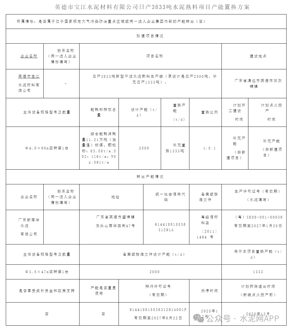 置換方案顯示,英德市寶江水泥2500t/d生產線補充產能1333t/d,補充后產能達3833t/d,退出產能來自廣東新南華水泥有限公司一條2000t/d生產線,置換比例1.5:1。