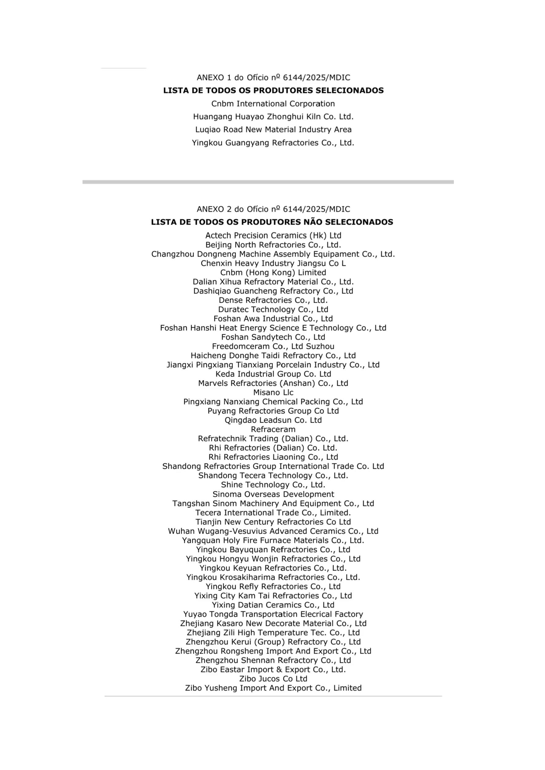 附件:耐火材料反傾銷案巴西調(diào)查機關(guān)抽樣名單