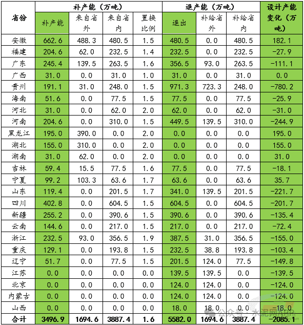 2024年10月,工信部下發(fā)《進一步規(guī)范水泥行業(yè)產(chǎn)能管理的通知》,旨在加強水泥行業(yè)產(chǎn)能治理,補產(chǎn)能置換是其中重要一項工作。據(jù)中國水泥網(wǎng)水泥大數(shù)據(jù)研究院統(tǒng)計,截至當(dāng)前,補產(chǎn)能公示項目僅100余例,累計補充產(chǎn)能3496.9萬噸,退出5582萬噸,凈減2085.1萬噸,凈減產(chǎn)能數(shù)量遠(yuǎn)少于需求下滑數(shù)量,供需矛盾放大,政策效果較差。