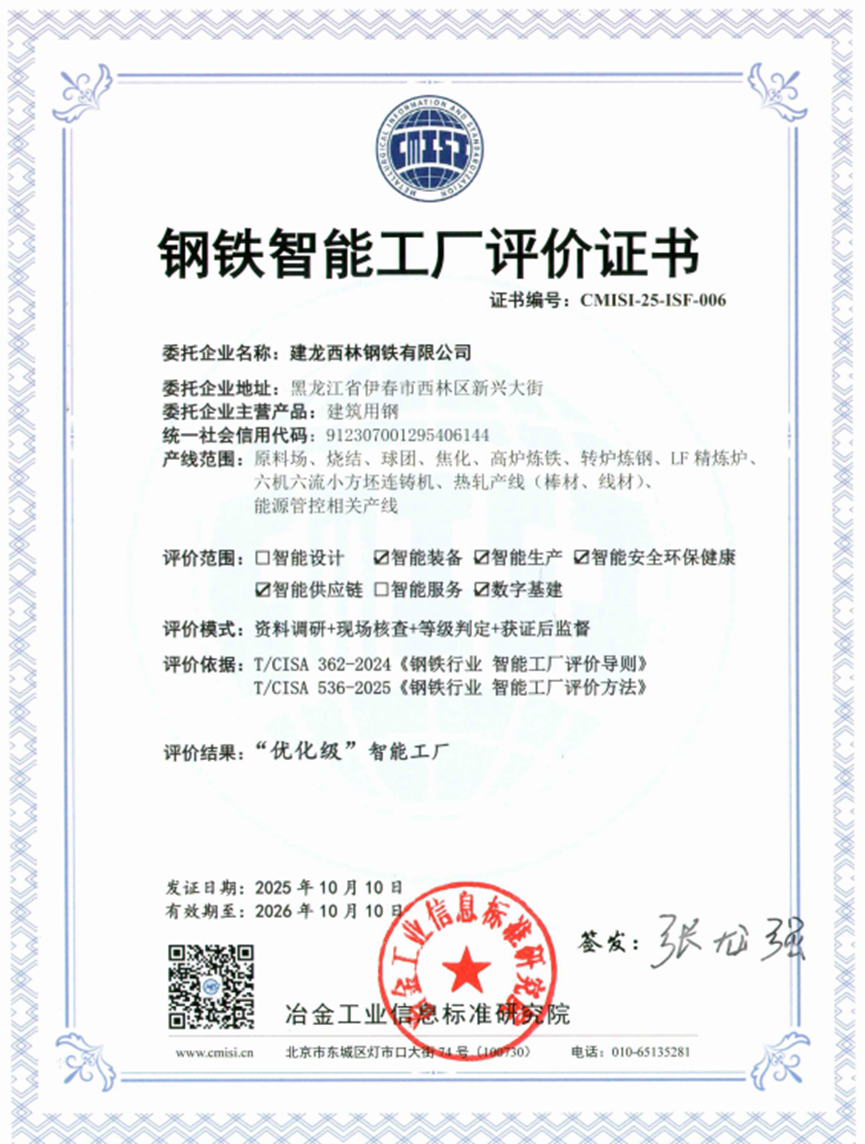 近日,在第六屆中國鋼鐵工業(yè)智能制造發(fā)展大會上,建龍西鋼被授予“優(yōu)化級”智能工廠評價證書,成為首批獲得該評價證書的10家鋼鐵企業(yè)之一,標志著建龍西鋼在智能工廠建設方面邁出了具有里程碑意義的關鍵一步。