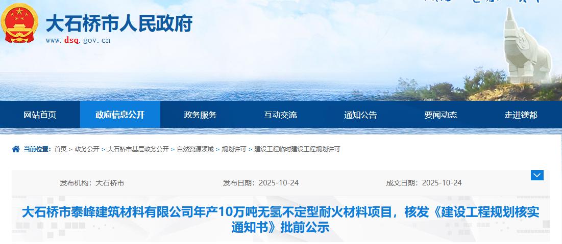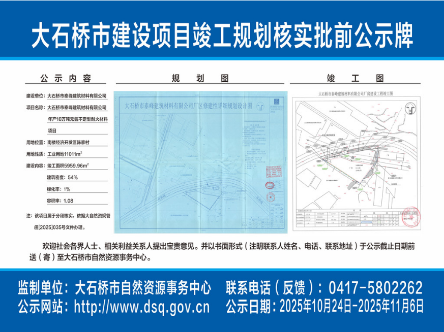 大石橋市泰峰建筑材料有限公司年產(chǎn)10萬噸無氫不定型耐火材料項(xiàng)目,核發(fā)《建設(shè)工程規(guī)劃核實(shí)通知書》批前公示