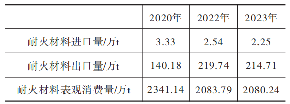 表2 2020—2023年我國耐火材料表觀消費量
