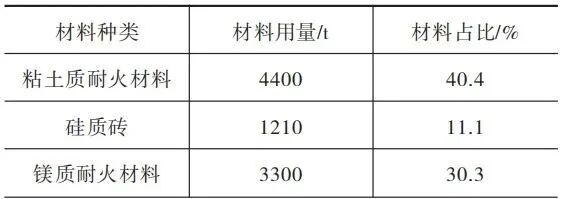 表4 700t/d浮法玻璃熔窯耐火材料配置及用量