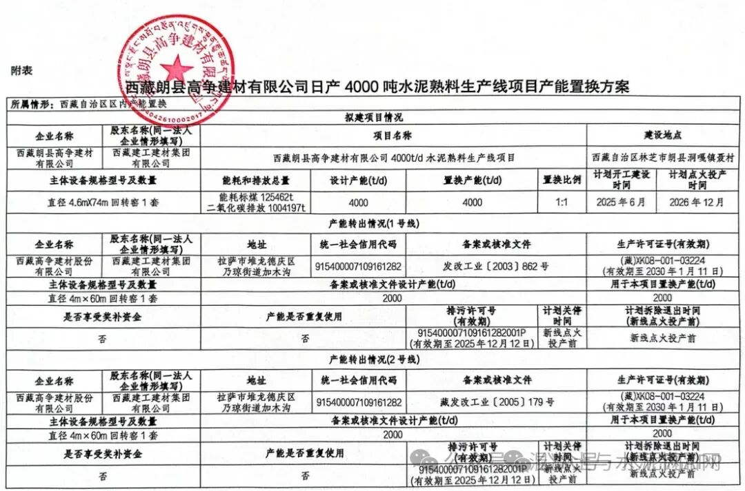 西藏朗縣高爭建材有限公司將1:1等量置換建設(shè)4000t/d水泥熟料生產(chǎn)線項目;建設(shè)地點為西藏自治區(qū)林芝市朗縣洞嘎鎮(zhèn)聶村;主體設(shè)備型號和數(shù)量為直徑4.6mX74m回轉(zhuǎn)窯1套;設(shè)計產(chǎn)能為4000t/d水泥熟料(年產(chǎn)120萬噸水泥熟料);能耗總量為125462t標煤(當量值,不含礦山開采)、二氧化碳排放總量為1004197t,擬建生產(chǎn)線按照能效標桿水平和環(huán)??冃級水平建設(shè),主要用能設(shè)備達到能效先進水平。預(yù)計2026年12月點火投產(chǎn)。
