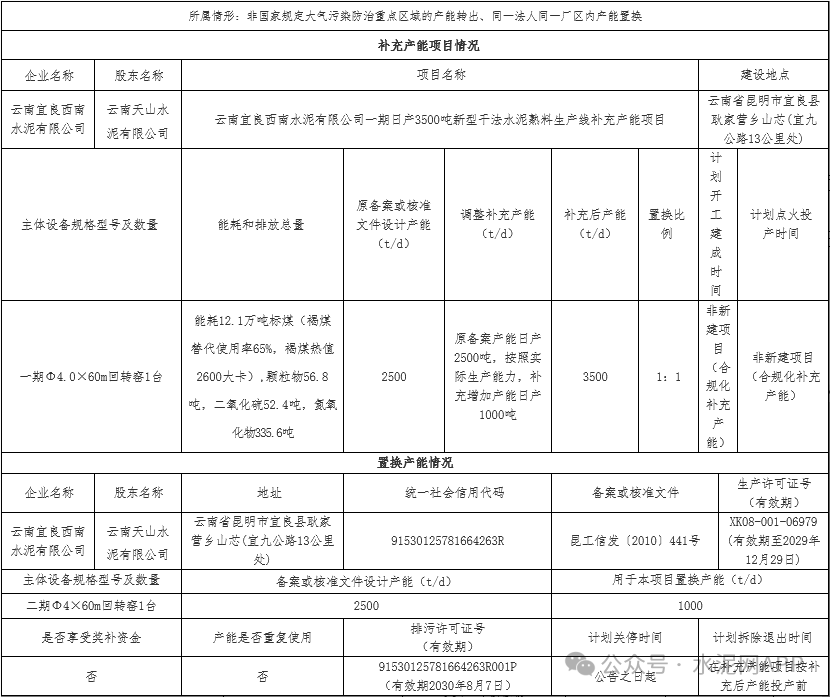 置換方案顯示,云南宜良西南水泥2500t/d熟料生產(chǎn)線補充產(chǎn)能1000t/d,補充后產(chǎn)能3500t/d,退出產(chǎn)能來自同公司一條2500t/d熟料線(用于本項目1000t/d),置換比例1:1。