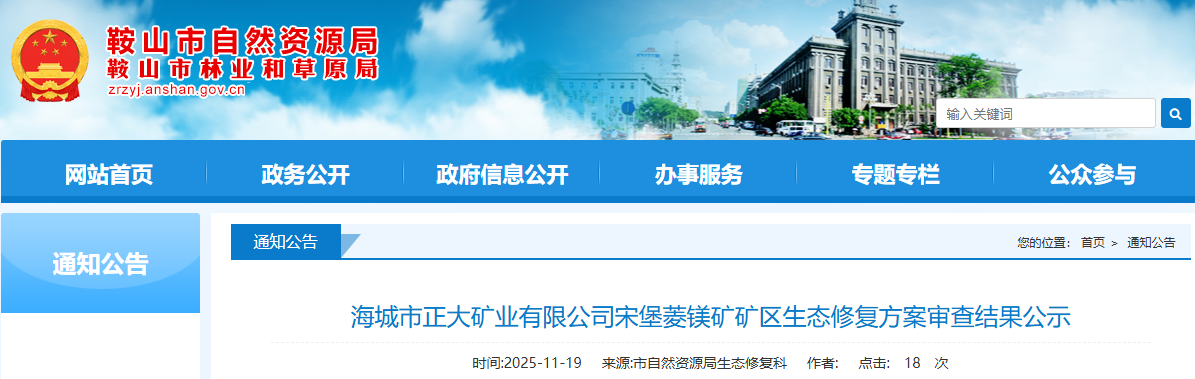 根據(jù)《遼寧省自然資源廳關(guān)于〈中華人民共和國礦產(chǎn)資源法〉實施衘接過渡期礦區(qū)生態(tài)修復方案評審工作的公告》、《遼寧省自然資源廳關(guān)于印發(fā)<礦山地質(zhì)環(huán)境保護與土地復墾方案省級審查管理辦法(試行)>的通知》(遼自然資發(fā)〔2022〕129號)有關(guān)要求,我局組織專家對《海城市正大礦業(yè)有限公司宋堡菱鎂礦礦區(qū)生態(tài)修復方案》進行了審查?,F(xiàn)將擬通過的方案及專家評審意見進行公示,公示期自發(fā)布之日起7個工作日。