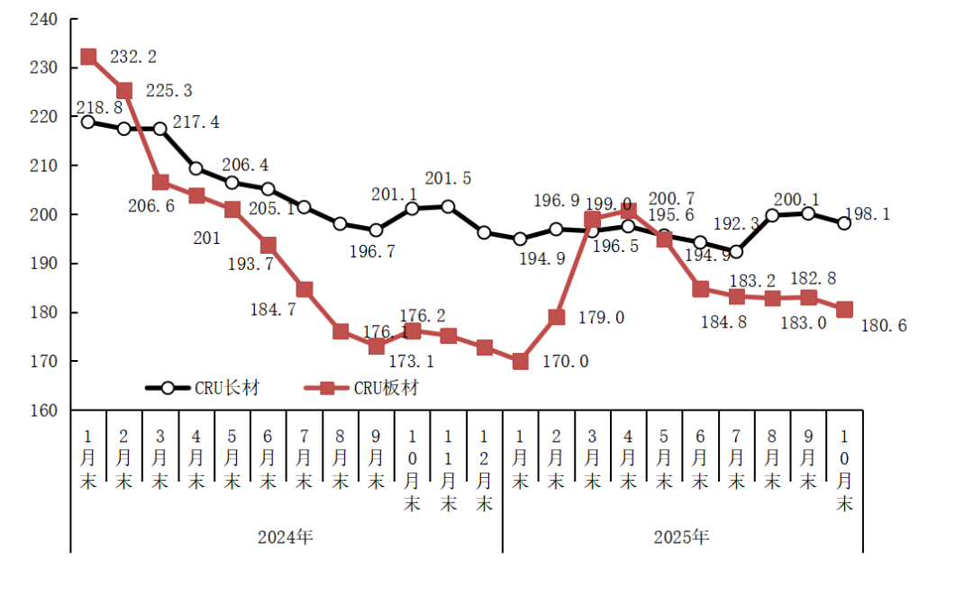 2025年10月份,CRU長(zhǎng)材指數(shù)為198.1點(diǎn),環(huán)比下降2.0點(diǎn),降幅為1.0 %;CRU板材指數(shù)為180.6 點(diǎn),環(huán)比下降2.4點(diǎn),降幅為1.3 %;與去年同期相比,CRU長(zhǎng)材指數(shù)下降3.0點(diǎn),降幅為1.5 %;CRU板材指數(shù)上升4.4 點(diǎn),升幅為2.5 %。(見(jiàn)下圖)