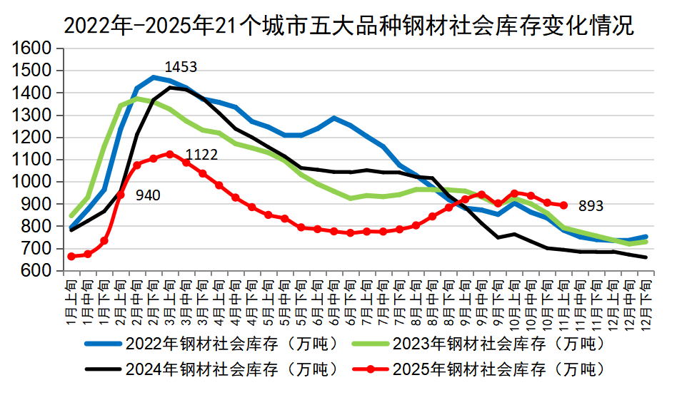 回顧上半年鋼材市場(chǎng)表現(xiàn):1至2月份,鋼材市場(chǎng)在淡季效應(yīng)、冬儲(chǔ)博弈等因素影響下區(qū)間震蕩運(yùn)行。3月份,在美國(guó)挑起關(guān)稅戰(zhàn)、原燃料價(jià)格弱勢(shì)運(yùn)行等背景下,鋼材價(jià)格弱勢(shì)震蕩,總體小幅下行。4月份,在外部沖擊不斷加大、需求回暖但不及預(yù)期影響下,鋼材價(jià)格延續(xù)震蕩下行趨勢(shì)。5至6月份,鋼材市場(chǎng)在需求不足、特朗普關(guān)稅政策影響、供需矛盾逐漸累積背景下,價(jià)格繼續(xù)下行,至6月末,國(guó)內(nèi)鋼材綜合價(jià)格指數(shù)跌破90點(diǎn),達(dá)到89.51點(diǎn),為2016年11月底以來(lái)新低水平。7月份,鋼材市場(chǎng)在“反內(nèi)卷”政策預(yù)期下呈現(xiàn)大幅上行態(tài)勢(shì)。8-9月份,鋼材市場(chǎng)在需求恢復(fù)不及預(yù)期、庫(kù)存壓力逐步加大的背景下震蕩下行,進(jìn)入10月份,國(guó)內(nèi)鋼材市場(chǎng)延續(xù)震蕩下行趨勢(shì),10月末鋼價(jià)雖有小幅回升但整體仍呈震蕩下行趨勢(shì),進(jìn)入11月份,受淡季效應(yīng)影響,需求快速下降,鋼價(jià)回歸偏弱的基本面,呈現(xiàn)震蕩偏弱運(yùn)行態(tài)勢(shì)。(見(jiàn)下表)