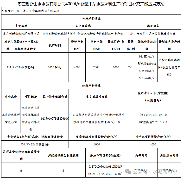 置換方案顯示,棗莊創(chuàng)新山水水泥4000t/d熟料生產線補充產能2000t/d,補充后產能6000t/d,退出產能來自棗莊山水水泥4000t/d熟料生產線,置換比例2:1。