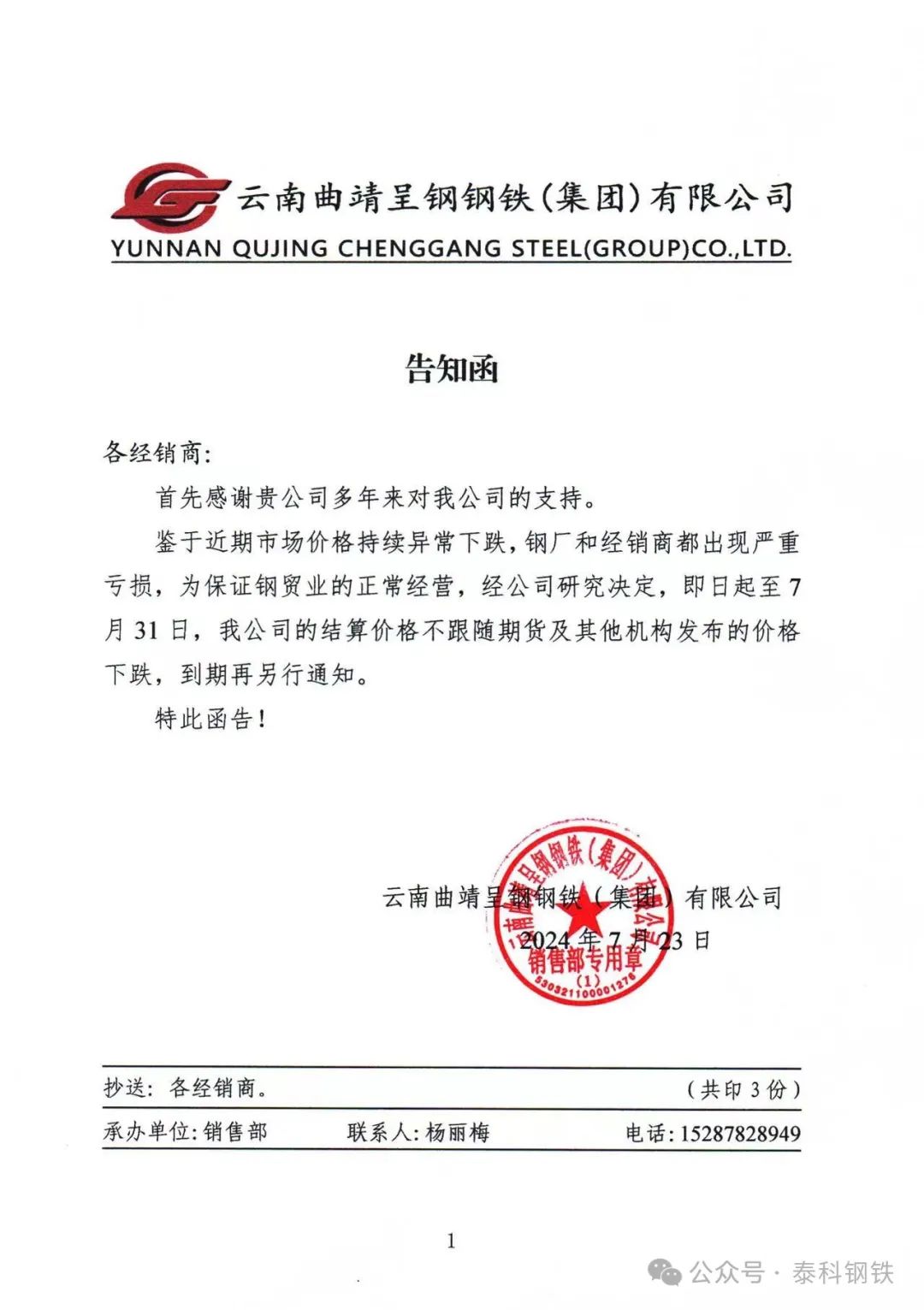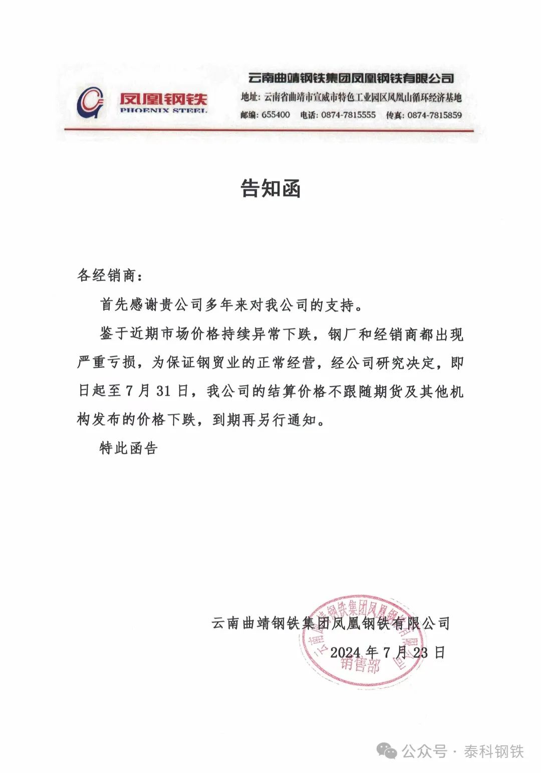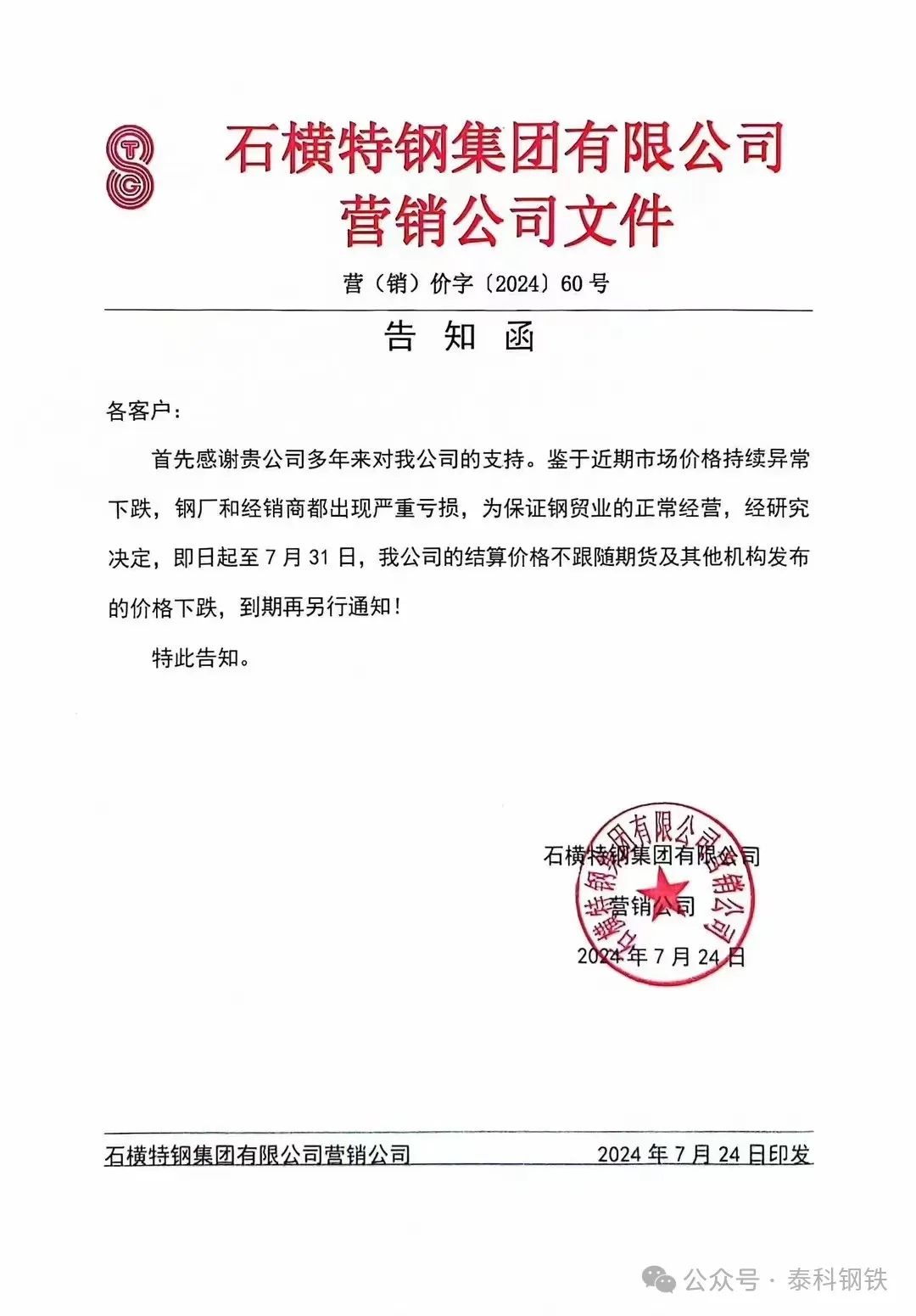 鋼廠紛紛發(fā)聲!!鑒于近期市場價格持續(xù)異常下跌,鋼廠和經(jīng)銷商都出現(xiàn)嚴(yán)重虧損,為保證鋼貿(mào)業(yè)的正常經(jīng)營,經(jīng)研究決定,即日起至7月31日,我公司的結(jié)算價格不跟隨期貨及其他機(jī)構(gòu)發(fā)布的價格下跌,到期再另行通知!