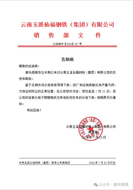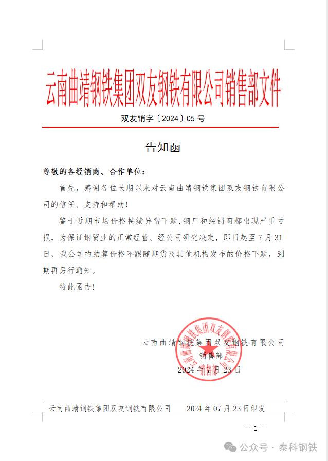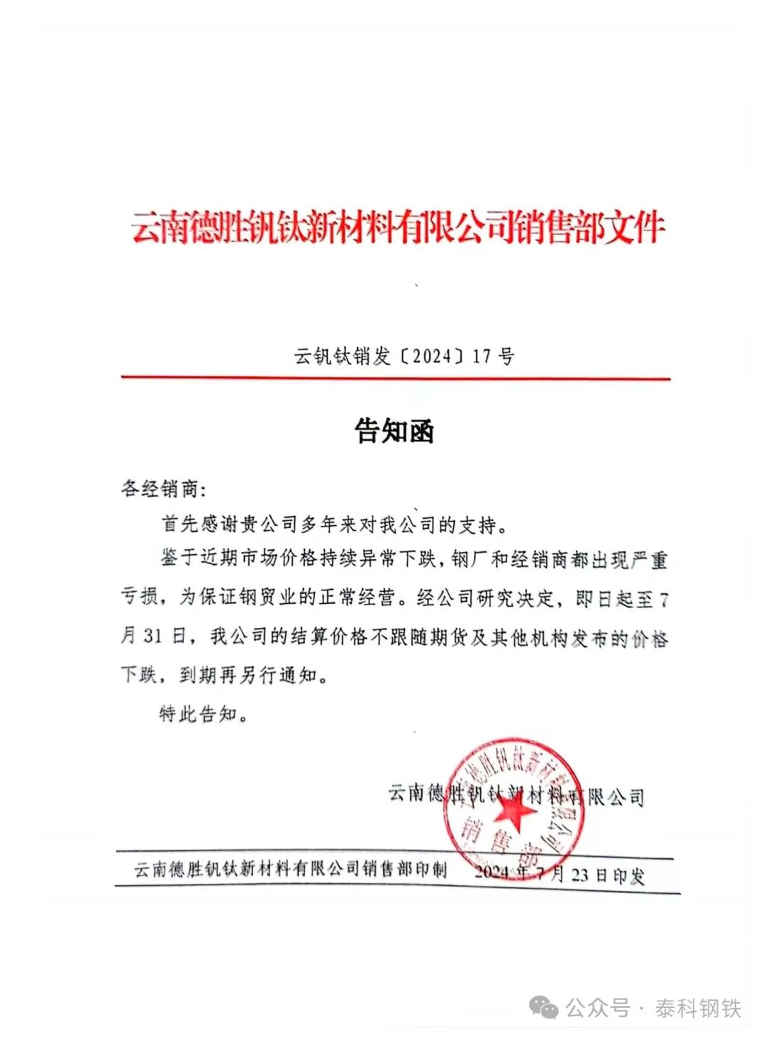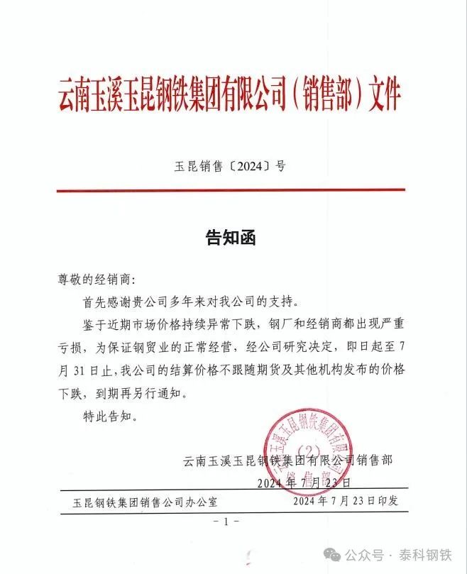鋼廠紛紛發(fā)聲!!鑒于近期市場價格持續(xù)異常下跌,鋼廠和經(jīng)銷商都出現(xiàn)嚴(yán)重虧損,為保證鋼貿(mào)業(yè)的正常經(jīng)營,經(jīng)研究決定,即日起至7月31日,我公司的結(jié)算價格不跟隨期貨及其他機(jī)構(gòu)發(fā)布的價格下跌,到期再另行通知!