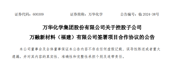 萬(wàn)華化學(xué)7月23日晚間公告,其控股子公司萬(wàn)融新材料(福建)有限公司(萬(wàn)融新材料)與阿布扎比國(guó)家石油公司(ADNOC)及其關(guān)聯(lián)公司北歐化工(Borealis)和博祿化學(xué)(Borouge)成功簽署《項(xiàng)目合作協(xié)議》。根據(jù)協(xié)議,四方將共同在福建省福州市建設(shè)一套特種聚烯烴一體化設(shè)施,開展產(chǎn)能為160萬(wàn)噸/年的特種聚烯烴項(xiàng)目。