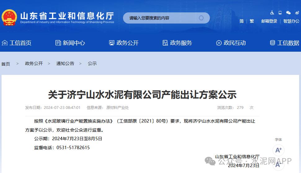 7月23日,山東省工業(yè)和信息化廳發(fā)布《關(guān)于濟(jì)寧山水水泥有限公司產(chǎn)能出讓方案公示》。