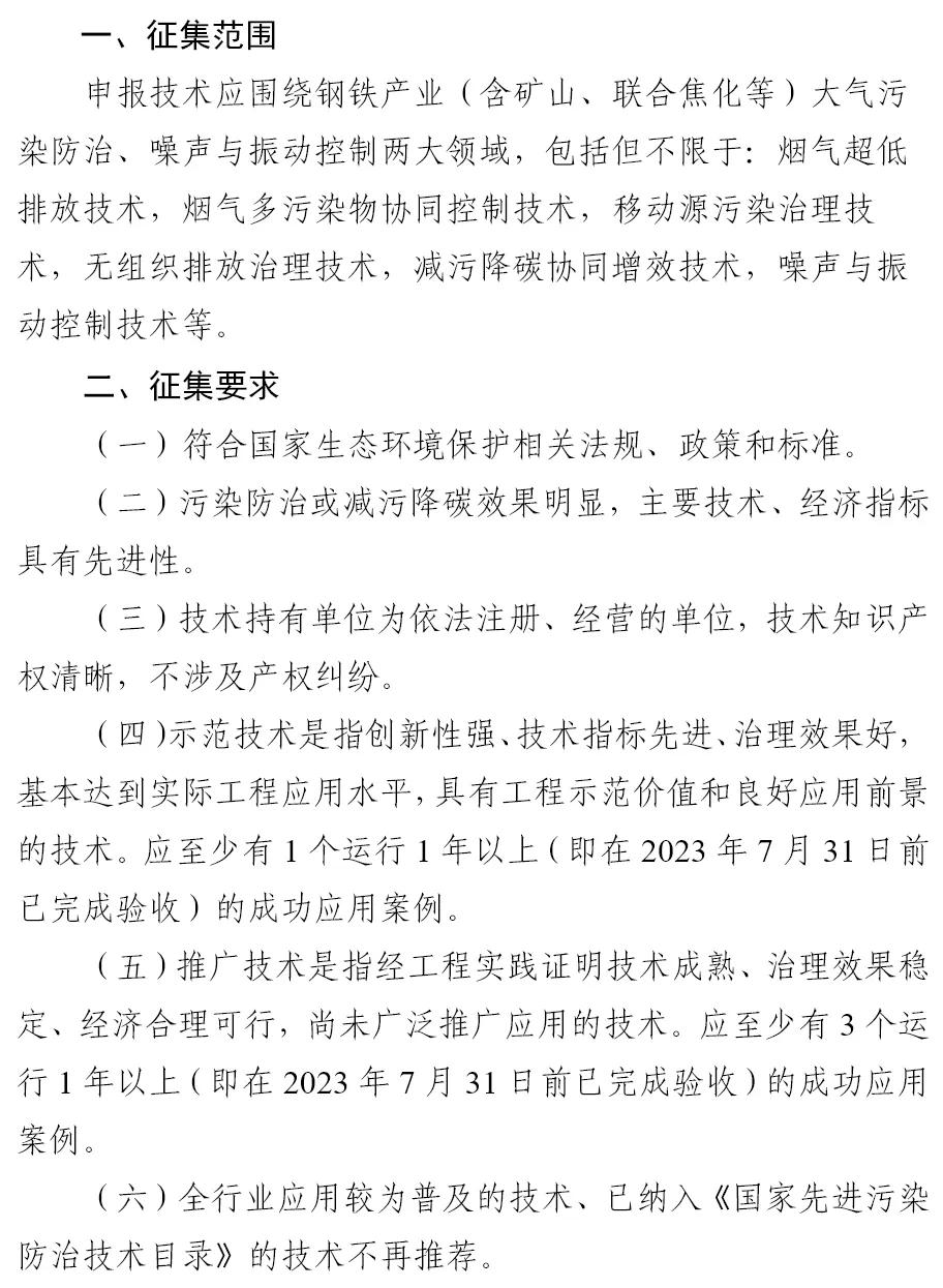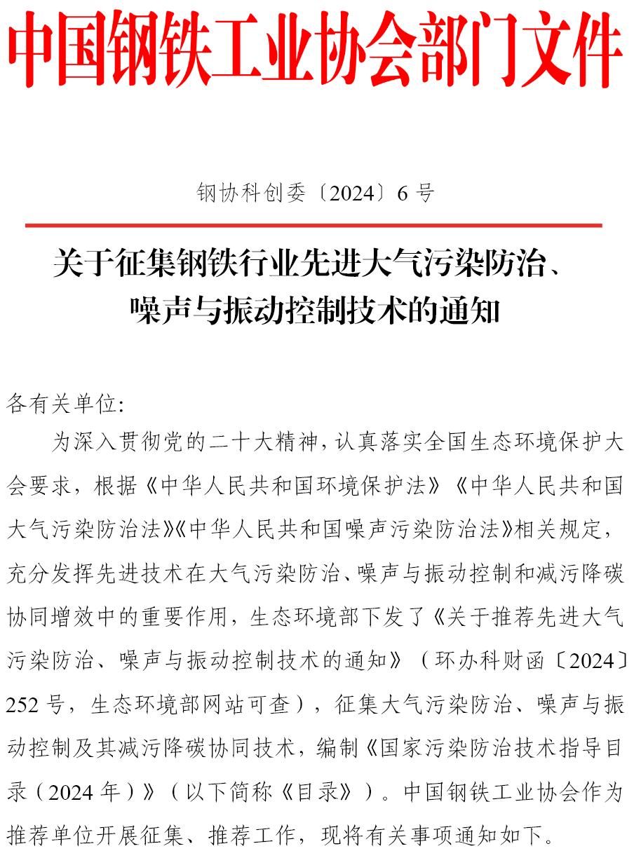 關于征集鋼鐵行業(yè)先進大氣污染防治、噪聲與振動控制技術的通知?