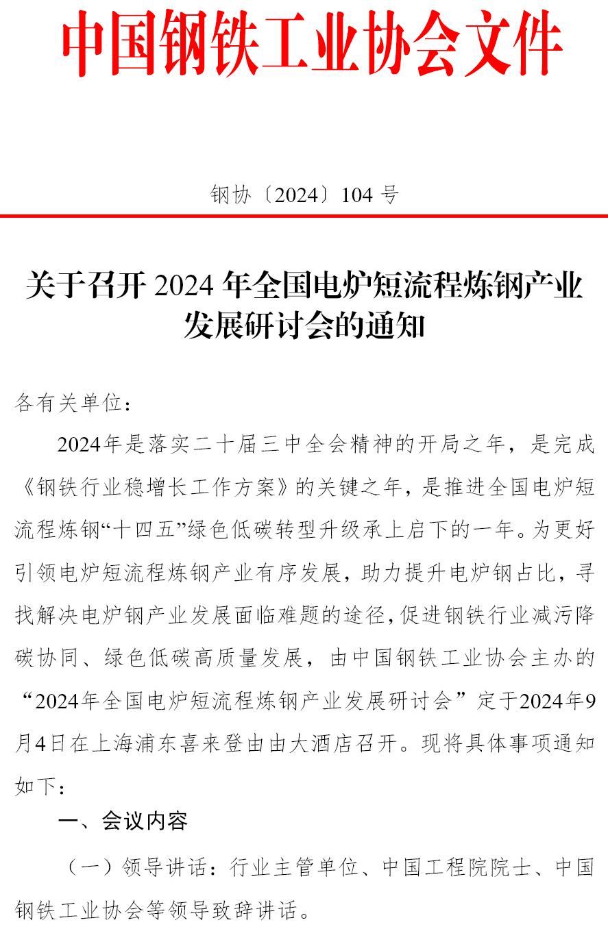 關(guān)于召開2024年全國電爐短流程煉鋼產(chǎn)業(yè)發(fā)展研討會的通知