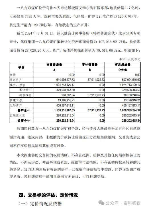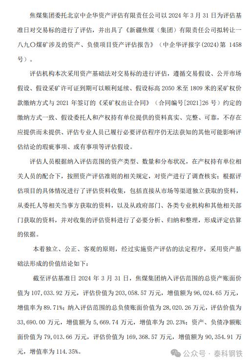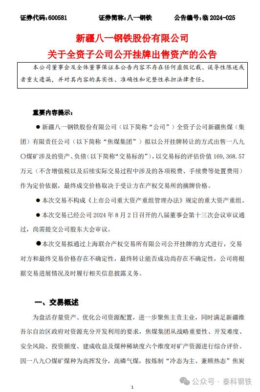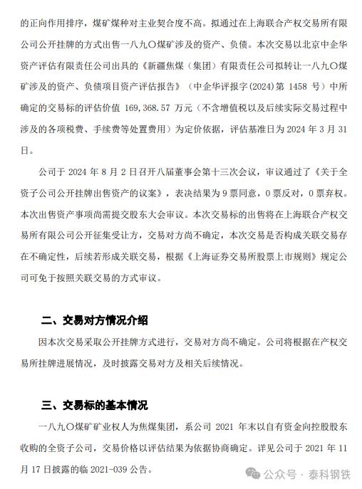 中國寶武旗下八一鋼鐵8月2日晚間發(fā)布公告稱,為盤活存量資產(chǎn)、優(yōu)化公司資源配置,進(jìn)一步聚焦主責(zé)主業(yè),同時(shí)滿足新疆維吾爾自治區(qū)政府對資源充分開發(fā)利用的要求,焦煤集團(tuán)從戰(zhàn)略重要性、開發(fā)難度、安全風(fēng)險(xiǎn)、投資額度、建成收益及煤種稀缺度六個(gè)維度對礦產(chǎn)資源進(jìn)行綜合評價(jià)。因一八九〇煤礦煤種為高揮發(fā)分,高磷氣煤,按煉制“冷態(tài)為主、兼顧熱態(tài)”焦炭的正向作用排序,煤礦煤種對主業(yè)契合度不高。擬通過在上海聯(lián)合產(chǎn)權(quán)交易所有限公司公開掛牌的方式出售一八九〇煤礦涉及的資產(chǎn)、負(fù)債。本次交易以北京中企華資產(chǎn)評估有限責(zé)任公司出具的《新疆焦煤(集團(tuán))有限責(zé)任公司擬轉(zhuǎn)讓一八九〇煤礦涉及的資產(chǎn)、負(fù)債項(xiàng)目資產(chǎn)評估報(bào)告》中所確定的交易標(biāo)的評估價(jià)值約16.94億元為定價(jià)依據(jù),評估基準(zhǔn)日為2024年3月31日。