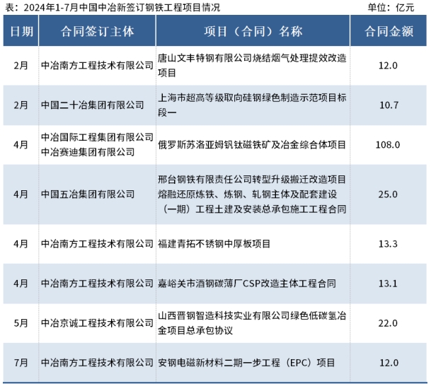 據(jù)中國中冶消息,2024年1-7月新簽合同額人民幣7504.4 億元,較上年同期降低6.4%,其中10億元以上的重大鋼鐵相關(guān)工程承包合同8個(gè),合同金額216.1億元,具體項(xiàng)目明細(xì)如下: