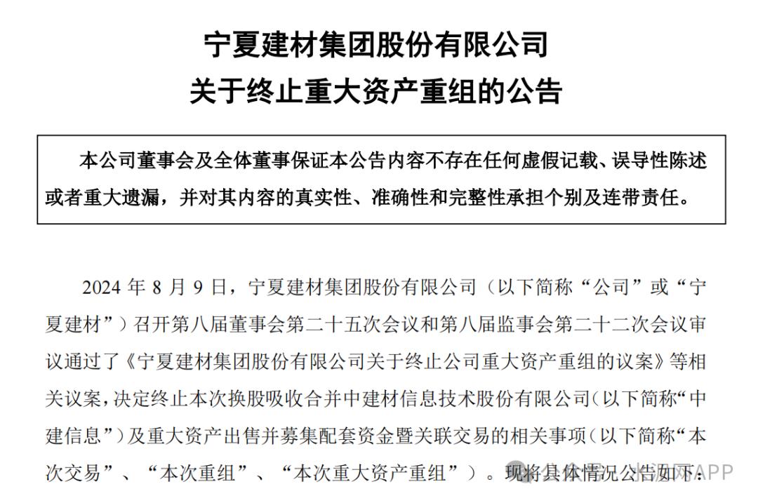 實為“老問題”未解決“當(dāng)時進(jìn)行這個重組交易主要就是為了解決我們和天山股份之間存在的同業(yè)競爭問題。目前,交易終止主要原因還是我們吸收合并的中建信息涉及的應(yīng)收賬款問題,經(jīng)過這么長時間,還是沒能梳理清晰?!?月13日下午,寧夏建材方面對記者表示。今年1月底,上交所便發(fā)布了關(guān)于終止寧夏建材吸收合并中建信息及重大資產(chǎn)出售并募集配套資金的審核決定。