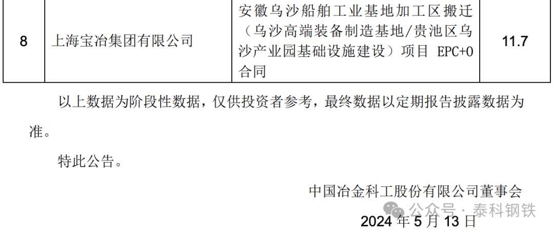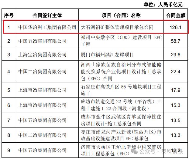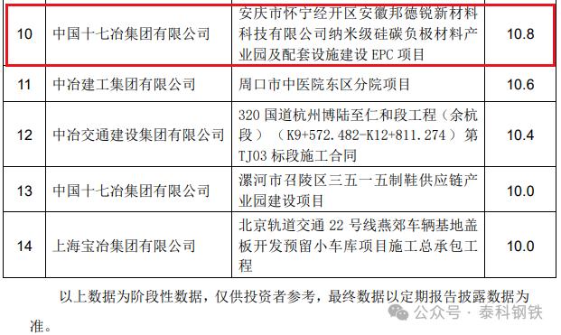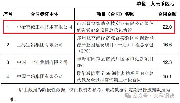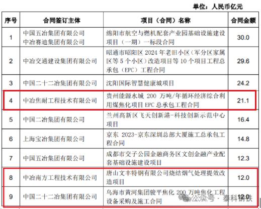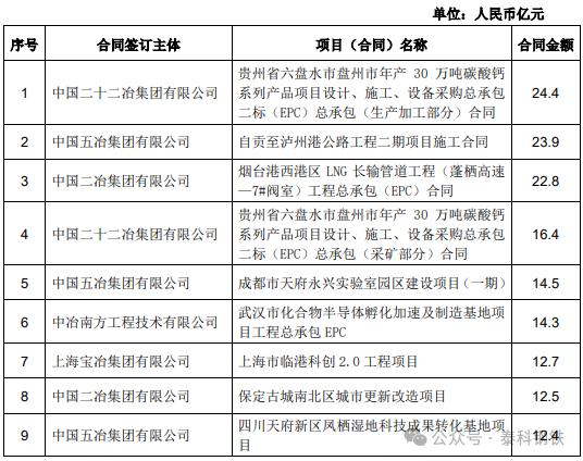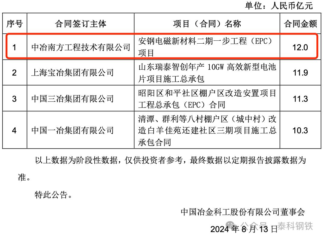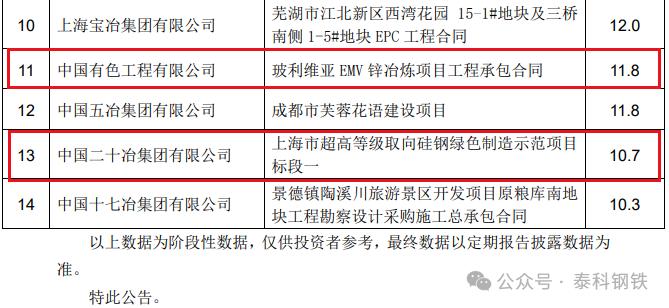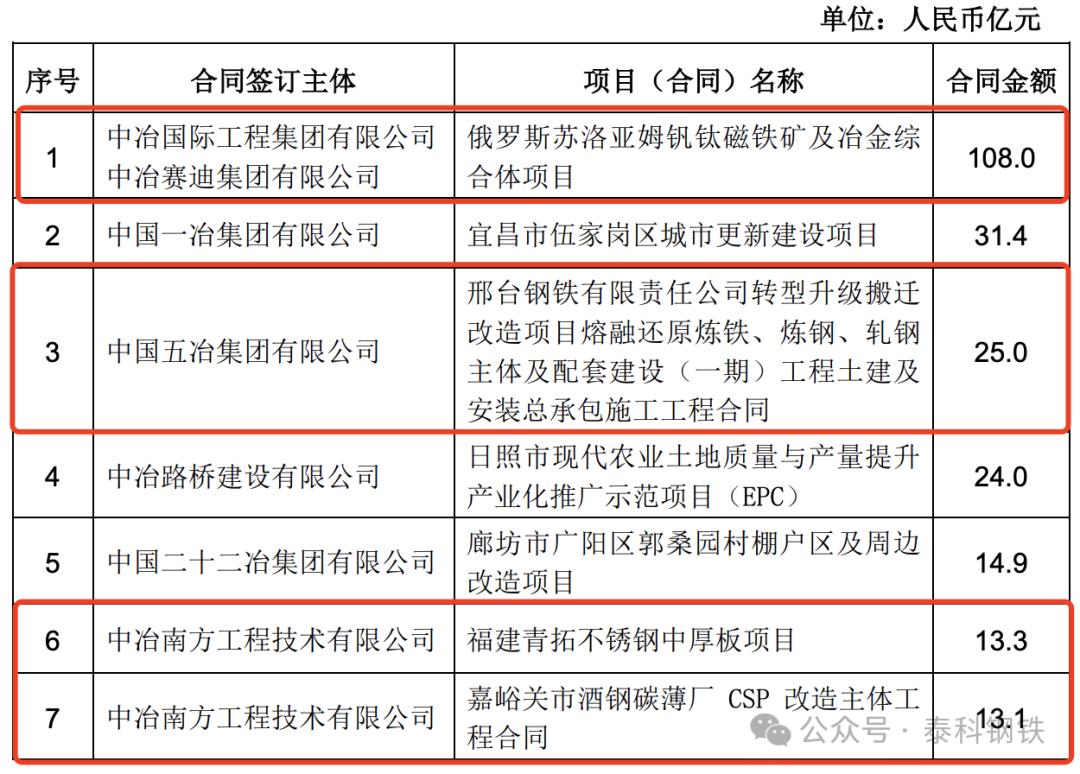 1、中冶南方工程技術(shù)有限公司簽唐山文豐特鋼有限公司燒結(jié)煙氣處理提效改造項(xiàng)目,合同額12億元;2、中冶焦耐工程技術(shù)有限公司簽貴州能源水城200萬噸/年循環(huán)經(jīng)濟(jì)綜合利用煤焦化項(xiàng)目EPC總承包工程合同,合同額21.1億元;3、中國二十二冶集團(tuán)有限公司簽烏海市黃河集團(tuán)駿平焦化200萬噸焦化工程設(shè)備采購及施工合同,合同額12億元;4、中國有色工程有限公司簽玻利維亞EMV鋅冶煉項(xiàng)目工程承包合同 ,合同額11.8億元;5、中國二十冶集團(tuán)有限公司簽上海市超高等級(jí)取向硅鋼綠色制造示范項(xiàng)目標(biāo)段一,合同額10.7億元;6、中冶國際工程集團(tuán)有限公司和中冶賽迪集團(tuán)有限公司簽俄羅斯蘇洛亞姆釩鈦磁鐵礦及冶金綜合體項(xiàng)目,合同額108億元;7、中國五冶集團(tuán)有限公司簽邢臺(tái)鋼鐵有限責(zé)任公司轉(zhuǎn)型升級(jí)搬遷 改造項(xiàng)目熔融還原煉鐵、煉鋼、軋鋼 主體及配套建設(shè)(一期)工程土建及安裝總承包施工工程合同,合同額25.0億元;8、中冶南方工程技術(shù)有限公司簽福建青拓不銹鋼中厚板項(xiàng)目,合同額13.3億元;9、中冶南方工程技術(shù)有限公司簽嘉峪關(guān)市酒鋼碳薄廠CSP改造主體工程合同,合同額13.1億元。10、中冶京誠工程技術(shù)有限公司簽山西晉鋼智造科技實(shí)業(yè)有限公司綠色低碳?xì)湟苯痦?xiàng)目總承包協(xié)議合同,合同額22.0億元。11、中國華冶科工集團(tuán)有限公司簽大石河鉬礦整體管理項(xiàng)目承包合同,合同額126.1億元。12、中冶南方工程技術(shù)有限公司安鋼電磁新材料二期一步工程(EPC) 項(xiàng)目,合同額12.0億元。中國中冶7月新簽單筆合同額在人民幣10億元以上的重大工程承包合同項(xiàng)目: