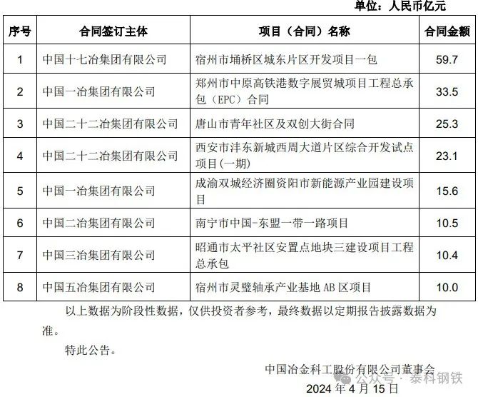 中國中冶4月新簽單筆合同額在人民幣10億元以上的重大工程承包合同項(xiàng)目: