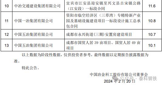 中國中冶2月新簽單筆合同額在人民幣10億元以上的重大工程承包合同項(xiàng)目: