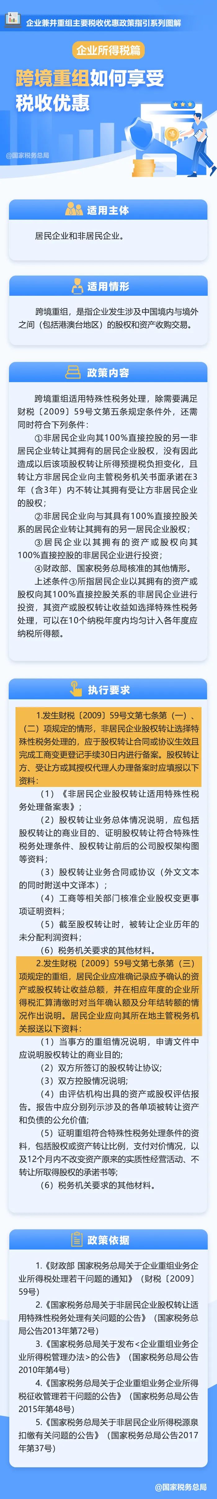 為引導(dǎo)企業(yè)正確適用兼并重組稅收政策,財(cái)政部、稅務(wù)總局等部門編寫了《企業(yè)兼并重組主要稅收優(yōu)惠政策指引》,對(duì)現(xiàn)行有效的支持企業(yè)兼并重組主要稅收優(yōu)惠政策和稅收征管文件進(jìn)行了梳理,并按照企業(yè)兼并重組的類型,分門別類明確了適用主體、適用情形、政策內(nèi)容、執(zhí)行要求及政策依據(jù)等內(nèi)容,為納稅人提供簡明易行、獲得感強(qiáng)的操作指南。今天學(xué)習(xí):企業(yè)兼并重組企業(yè)所得稅優(yōu)惠政策——跨境重組如何享受稅收優(yōu)惠?