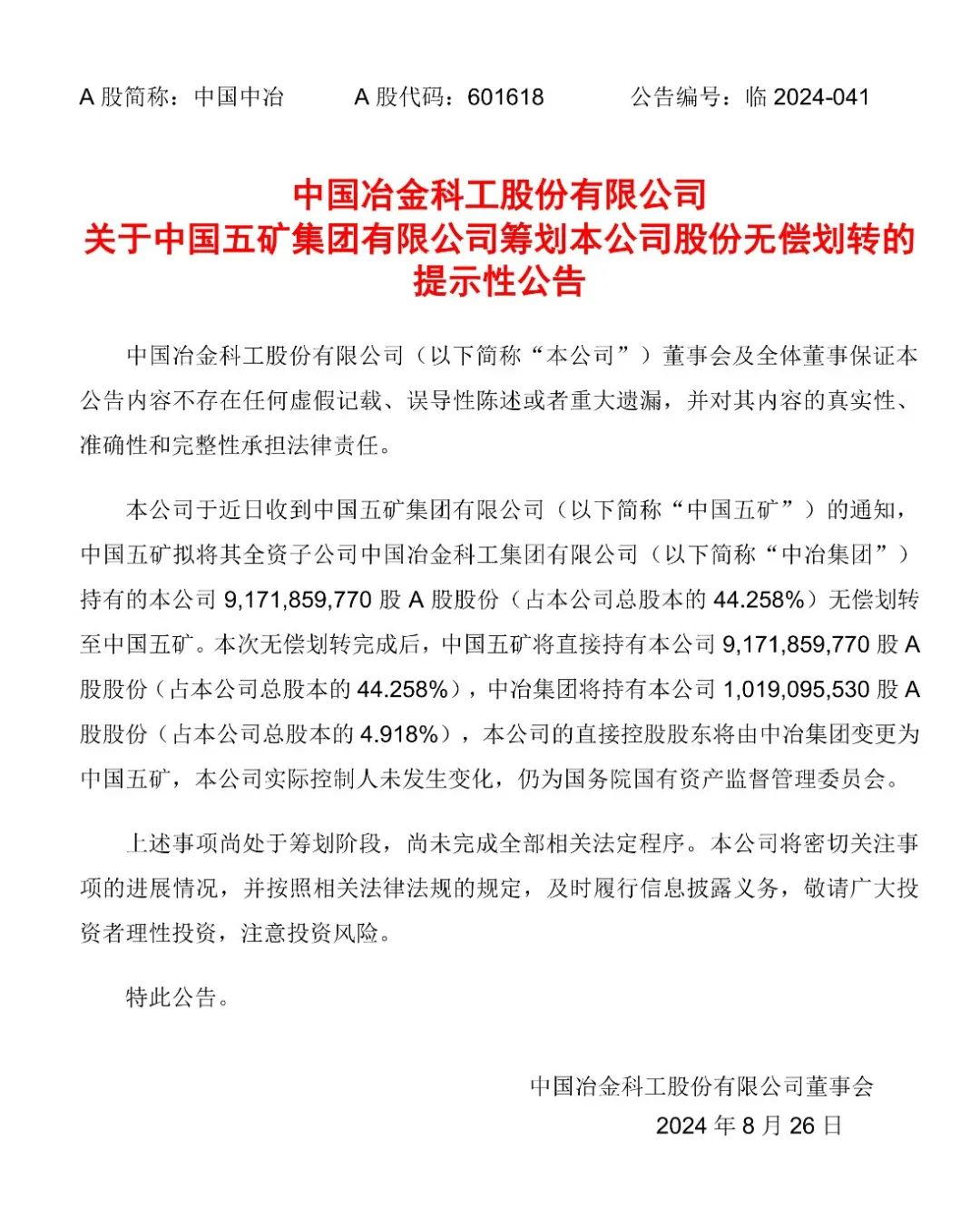 8月27日,中國冶金科工股份有限公司(以下簡稱“中國中冶”)發(fā)布了《中國中冶關(guān)于中國五礦集團有限公司籌劃本公司股份無償劃轉(zhuǎn)的提示性公告》(以下簡稱《公告》)。《公告》主要內(nèi)容為:中國中冶于近日收到中國五礦集團有限公司(以下簡稱“中國五礦”)的通知,中國五礦擬將其全資子公司中國冶金科工集團有限公司(以下簡稱“中冶集團”)持有的中國中冶9,171,859,770股A股股份(占公司總股本的44.258%)無償劃轉(zhuǎn)至中國五礦。本次無償劃轉(zhuǎn)完成后,中國五礦將直接持有中國中冶9,171,859,770股A股股份(占公司總股本的44.258%),中冶集團將持有中國中冶1,019,095,530股A股股份(占公司總股本的4.918%),中國中冶的直接控股股東將由中冶集團變更為中國五礦。