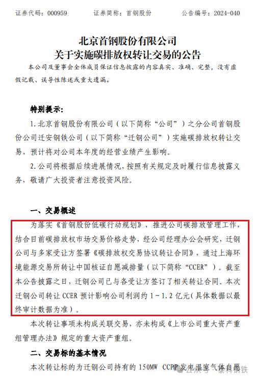 首鋼股份9月10日公告,公司之分公司首鋼股份公司遷安鋼鐵公司(以下簡稱“遷鋼公司”)實(shí)施碳排放權(quán)轉(zhuǎn)讓交易,預(yù)計(jì)將對公司本年度的經(jīng)營業(yè)績產(chǎn)生影響。遷鋼公司CCPP發(fā)電項(xiàng)目于2013年正式啟動(dòng),2015年獲得中華 人民共和國國家發(fā)展和改革委員會(huì)成功備案。根據(jù)遷鋼公司與各受讓方簽訂的《碳排放權(quán)交易協(xié)議轉(zhuǎn)讓合同》,本次遷鋼公司通過競價(jià)方式確定受讓方,共計(jì)轉(zhuǎn)讓CCER總量148.7169萬噸,轉(zhuǎn)讓均價(jià)96.00元/噸(含稅),轉(zhuǎn)讓價(jià)款1.4277億元。本次轉(zhuǎn)讓完成后,預(yù)計(jì)影響公司利潤約1~1.2億元。