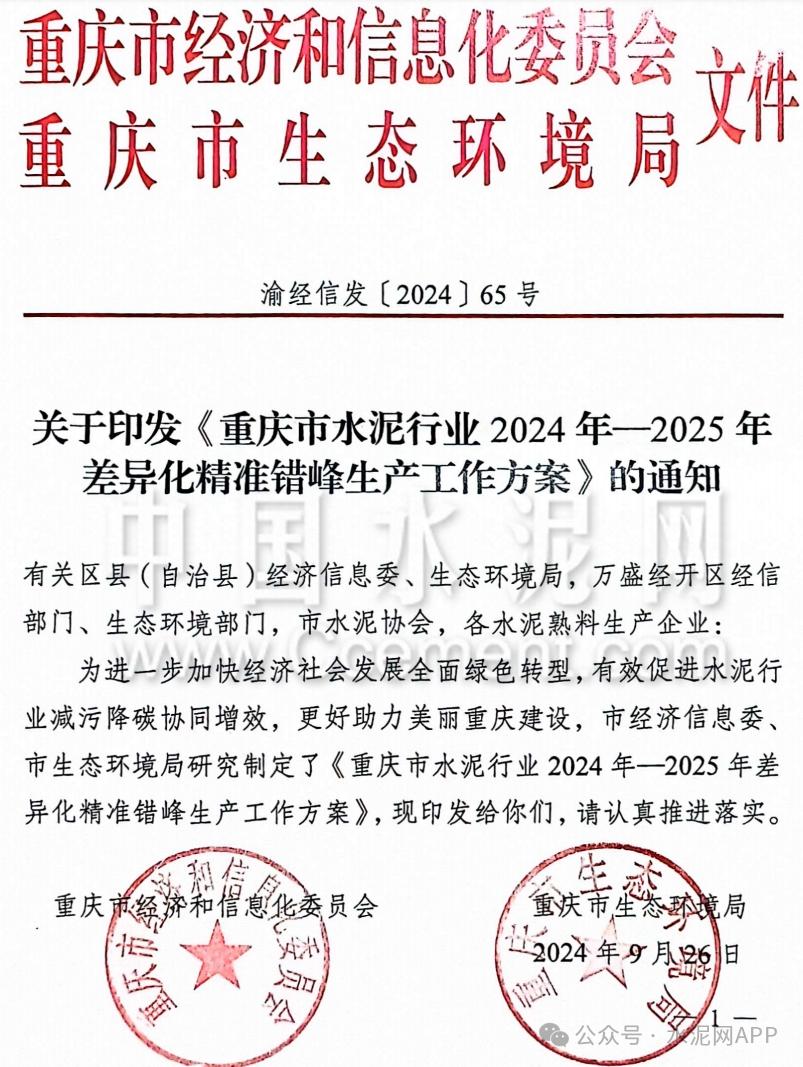 日前,重慶市經(jīng)信委和生態(tài)環(huán)境局聯(lián)合發(fā)布《重慶市水泥行業(yè)2024年-2025年差異化精準(zhǔn)錯(cuò)峰生產(chǎn)工作方案》的通知。