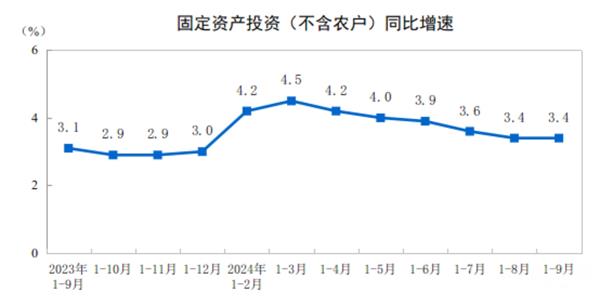 2024年前三季度,全國(guó)固定資產(chǎn)投資(不含農(nóng)戶)378978億元,同比增長(zhǎng)3.4%(按可比口徑計(jì)算),其中,民間固定資產(chǎn)投資191001億元,下降0.2%。從環(huán)比看,9月份固定資產(chǎn)投資(不含農(nóng)戶)增長(zhǎng)0.65%。