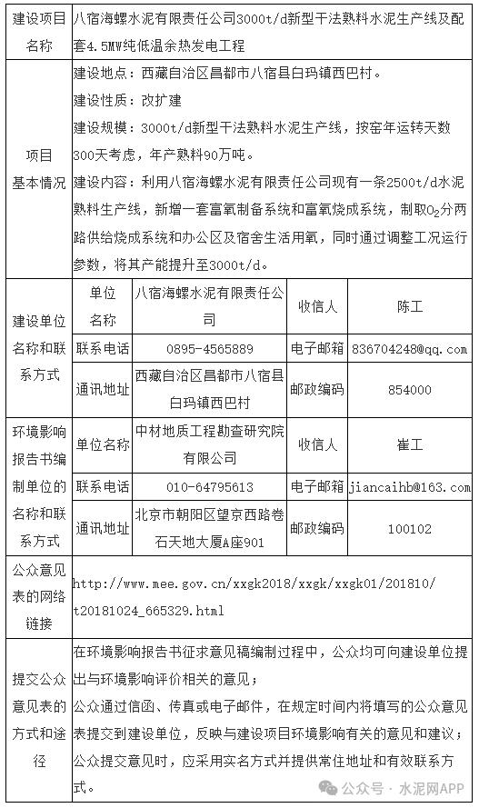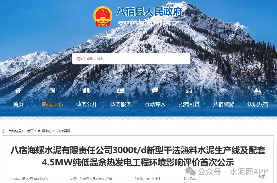日前,西藏八宿縣人民政府網(wǎng)站發(fā)布《八宿海螺水泥有限責(zé)任公司3000t/d新型干法熟料水泥生產(chǎn)線(xiàn)及配套4.5MW純低溫余熱發(fā)電工程環(huán)境影響評(píng)價(jià)首次公示》。