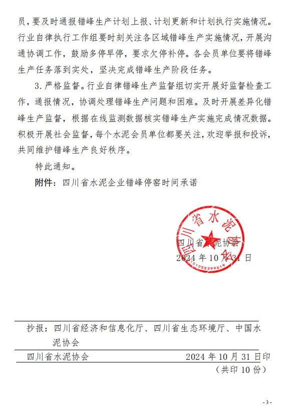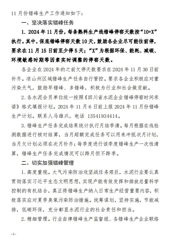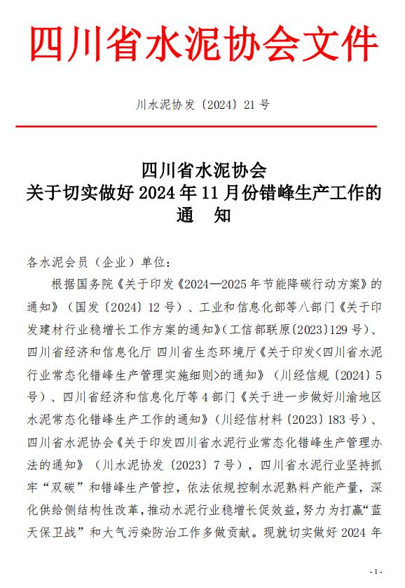 近日,四川省水泥協(xié)會發(fā)布“關(guān)于切實做好2024年11月份錯峰生產(chǎn)工作的通知”。2024年11月份,每條熟料生產(chǎn)線錯峰停窯天數(shù)按“10+X執(zhí)行。其中,保底錯峰停窯天數(shù)10天,鼓勵各企業(yè)盡可能往前停要求在11月15日前至少停5天;“X”為根據(jù)環(huán)保、能耗、減碳環(huán)境敏感時期等因素實時調(diào)整的停窯天數(shù)。各企業(yè)在 2024 年的之前欠停天數(shù)要求在2024年11月30 日前補齊。涼山州區(qū)域錯峰生產(chǎn)任務(wù)自行管控。要求各企業(yè)積極應(yīng)對重污染天氣,鼓勵早錯峰、多錯峰,積極為行業(yè)和社會做貢獻。