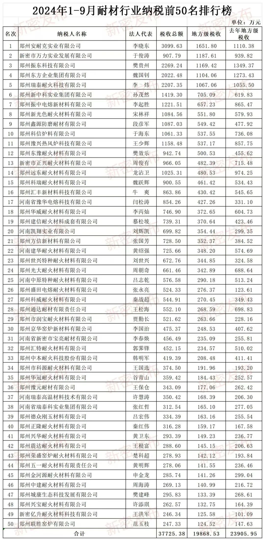 新密市2024年1-9月耐材行業(yè)納稅前50名排行榜