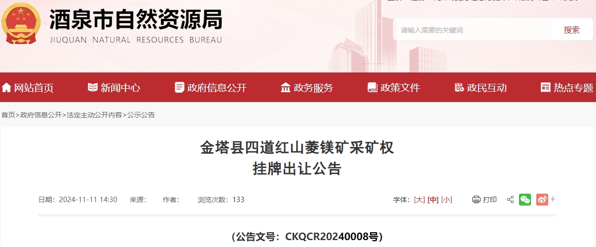 按照《中華人民共和國礦產(chǎn)資源法》《中華人民共和國拍賣法》《中華人民共和國招標(biāo)投標(biāo)法》及其實施條例、《礦業(yè)權(quán)出讓交易規(guī)則》《自然資源部關(guān)于進一步完善礦產(chǎn)資源勘查開采登記管理的通知》《自然資源部關(guān)于深化礦產(chǎn)資源管理改革若干事項的意見》《礦業(yè)權(quán)出讓收益征收辦法》《自然資源部財政部關(guān)于制定礦業(yè)權(quán)出讓收益起始價標(biāo)準(zhǔn)的指導(dǎo)意見》等有關(guān)規(guī)定,酒泉市自然資源局委托甘肅盛鵬源拍賣有限公司對金塔縣四道紅山菱鎂礦采礦權(quán)掛牌出讓?,F(xiàn)將有關(guān)事宜公告如下: