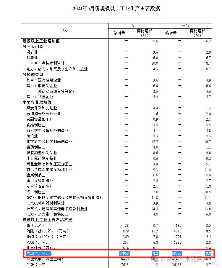5月份,規(guī)模以上工業(yè)增加值同比實(shí)際增長(zhǎng)5.6%(增加值增速均為扣除價(jià)格因素的實(shí)際增長(zhǎng)率)。從環(huán)比看,5月份,規(guī)模以上工業(yè)增加值比上月增長(zhǎng)0.30%。1—5月份,規(guī)模以上工業(yè)增加值同比增長(zhǎng)6.2%。其中,5月份水泥產(chǎn)量17953萬(wàn)噸,同比下降8.2%;1-5月水泥產(chǎn)量68727萬(wàn)噸,同比下降9.8%。此外,數(shù)據(jù)顯示,2023年1-5月份,全國(guó)水泥產(chǎn)量77141萬(wàn)噸,中國(guó)水泥網(wǎng)由此計(jì)算,今年的絕對(duì)值比去年同期減少8414萬(wàn)噸,降幅10.91%。