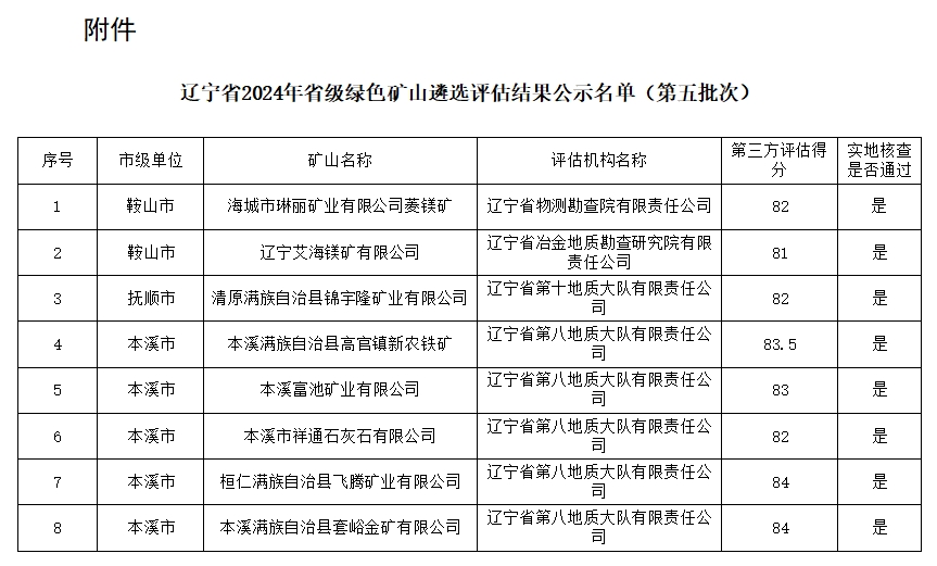 附 件:遼寧省2024年省級(jí)綠色礦山遴選評(píng)估結(jié)果公示名單(第五批次)
