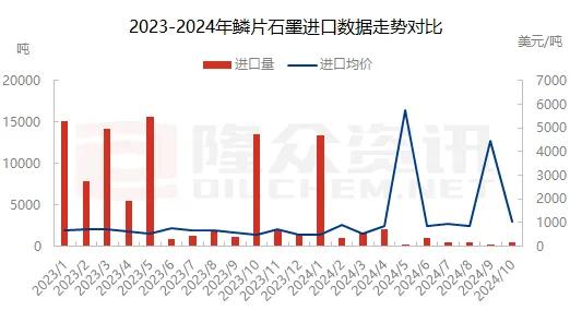 2024年10月我國鱗片石墨進(jìn)口量為414.3噸,環(huán)比上漲1478.11%,進(jìn)口總金額為423848美元,進(jìn)口均價為1023美元/噸,環(huán)比下降76.96%。2024年1-10月累計進(jìn)口量為2.01萬噸,較去年同期減少5.64萬噸,降幅為73.68%。